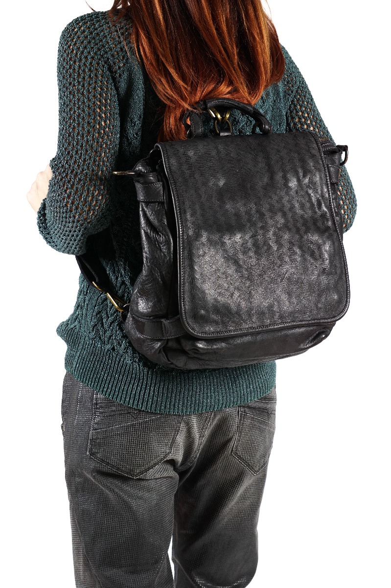 Juodos spalvos kuprinė pagaminta iš minkštos veršiuko odos. Kuprinė lengvai transformuojasi į rankinės modelį - pakeitus jos rankenas. Ši kuprinė patiks mėgstančioms daug kišenėlių, nes būtent ji ir turi daug atskirų užsegamų kišenėlių. Viduje yra austas medvilnės pamušalas ir vienas pagrindinis erdvus skyrius, kuriame yra kišenė su užtrauktuku ir dvi mini kišenėlės telefonui ar smulkmenoms. Labai praktiškas dizainas, norinčioms turėti ir kuprinę ir stilingą rankinę.