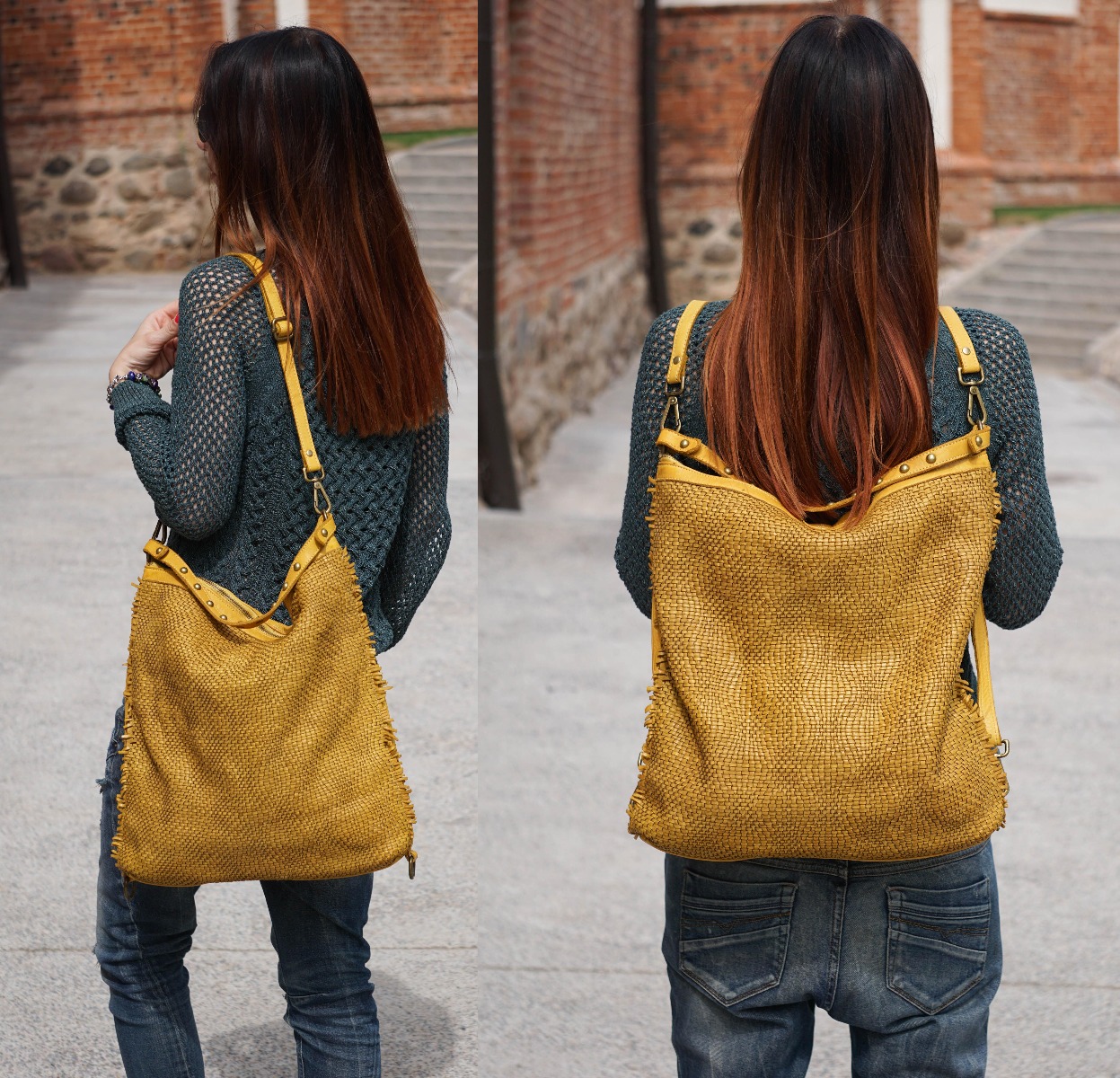 Natūralios odos moteriška kuprinė ir rankinė geltonos spalvos